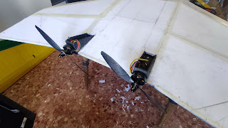 Estreno de la nueva Alita construida por Rafa López (el que suscribe), plano a partir de la Berkik V3 escalado al doble dando una envergadura de 260cm y 90cm de fuselaje, la V4, se ha modificado y adaptado para poder despegar del suelo instalandole tren triciclo y con semialas desmontables para el transporte, en principio voló con dos motores que daban unos tres quilos de empuje e iba muy justa por lo que se instalaron otros dos motores y palas 10x6 carbono, con los cuatro motores se defiende bíen. Construida con cartón pluma de 5mm principalmemte, salvo un par de costillas en contrachapado para la union de las alas al fuselaje y unos refuerzos de ese mismo material para fijar los trenes. Os dejo unas fotos de la construcción y algunos de los primeros vuelos.